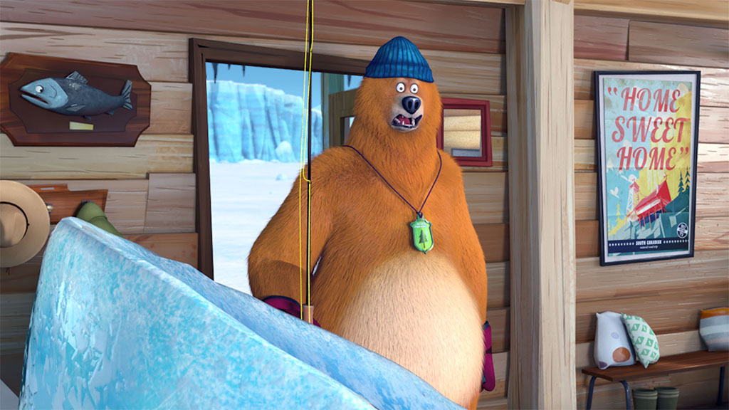 Grizzy goes fishing giving the lemmings the opportunity to transform the cabin into a giant ice slide
